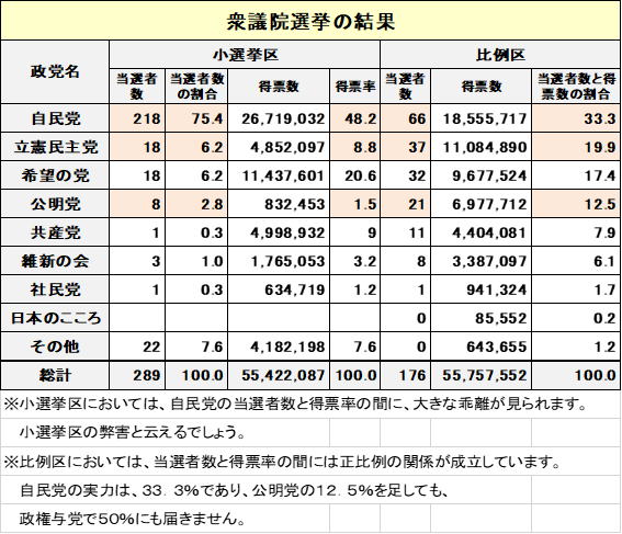 ●選挙結果は、残念ながらご承知のとおり自公が議員総数の2/3を超える334(自民党284、公明党50)議席を獲得しました。しかし、自民党の比例区の得票率は33.3%に過ぎず、立憲民主党19.9%の健闘ぶりに自民党では勝利感が乏しいといわれています。
