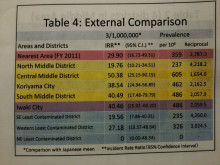 津田教授らは、福島県や福島県立医大が原発事故当時、18歳未満だった子どもたちを対象に実施している甲状腺の超音波エコー検査の結果を分析。人口を基に福島県を9つの地域に分け、2014年12月31日までに集計された検査結果の公表データから、二本松市を中心とする中通りの中部で日本全国の年間発生率と比較して約50倍に達したことが分かったという。郡山市でも約38倍、須賀川市や白河市などの郡山以南、いわき市では約40倍だった。福島市を中心とした北部地区は約19倍、会津地方では約27倍だった。甲状腺検査が最も早く2011年に実施された相双地区は約29倍で、中通りに比べて数値そのものは低かったが、津田教授は「潜伏期間を考えると、1年未満で30倍近く多発したことは重要だ」と話した。