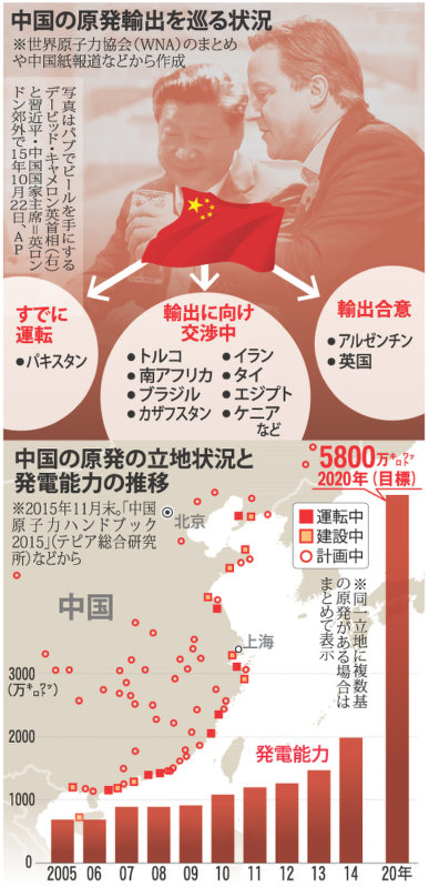 中国の原子力産業協会などによると、中国国内で稼働中の原発は28基で、建設中の原発も27基ある。今後5年で発電能力を約3倍に増やし、世界第2位のフランスに迫る計画。さらに、2030年までに世界60カ国で200基超の原発建設を計画しているという。10月に輸出が決まった英国のほかにも南アフリカやケニア、スーダンなどの新興・途上国への輸出計画を進めており、一帯一路の構想通りに自国の影響力を拡大し原発大国への道をひた走る。