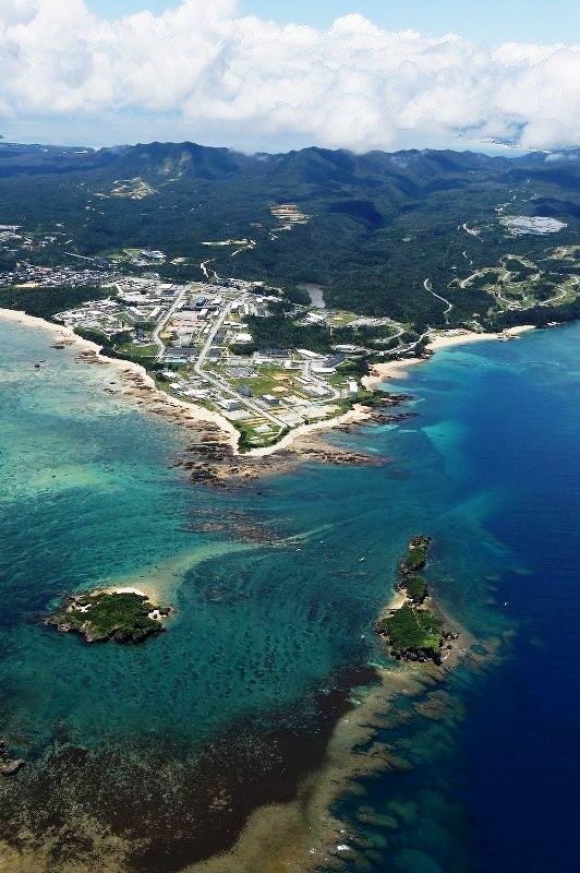 米軍普天間飛行場の移設が計画されている名護市辺野古周辺=本社機「希望」から2016年6月、竹内幹撮影