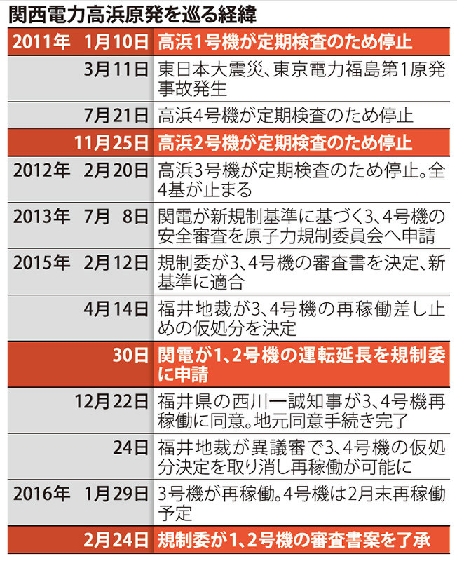 | ●福井・高浜原発 1,2号機運転40年超、審査合格 老朽原発に不安 地元は「心配ない」 毎日新聞2016年2月24日 |