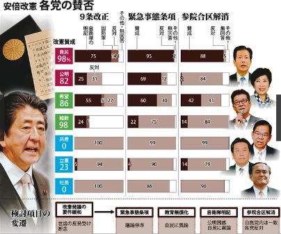 一方、希望は55%が自衛隊明記を支持し、自民に次ぐ高率だが、改正反対も27%と党内のばらつきが大きい。公示前後に小池百合子代表(東京都知事)の9条を巡る発言が揺れたうえ、「安倍改憲には反対」の立場だった民進党出身者の多さも影響しているようだ。維新は自衛隊明記は24%だったが、回答のトップは無回答の69%。選挙後の与野党協議に含みを残した。