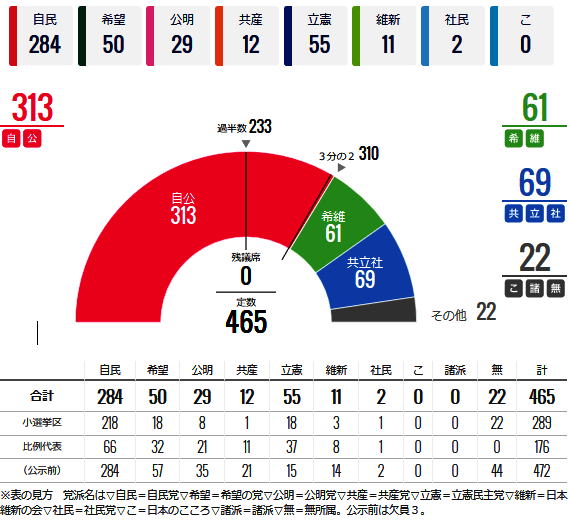 衆院選の結果を受け、朝日新聞社は23、24日、全国世論調査(電話)を実施した。自民党と公明党合わせて定数の3分の2を超える議席を得たことについて尋ねると、「多すぎる」が51%で、「ちょうどよい」32%を上回った。