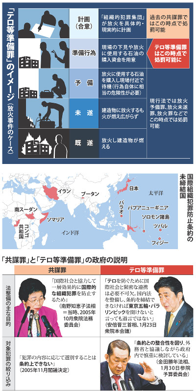 A 東京五輪を念頭に「一般市民を対象とする法改正ではなく、テロ対策である」と強調する狙いがあります。条約は当初、主にマフィアなどによる人身売買や薬物密輸などの経済犯罪への対応を目的に作られました。政府は「条約は起草(きそう)段階からテロ活動も対象に議論が行われている。テロは組織犯罪の典型で、関連性がある」と説明しています。