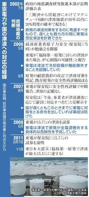 国も06年の指針改訂で津波対策を明記しながら、地震の揺れ対策のチェックを優先した。判決は、浸水の可能性があり、東電の自発的な対応が見込めないなら、口頭の指示でなく命令を出すべきだったとした。