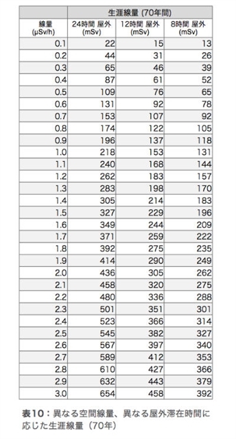 これには、高濃度の放射能が飛散した事故直後の被ばくは入っていません。 また、被ばくには、体の外から受ける外部被ばくと、呼吸や食べ物から体内に取り込まれる内部被ばくがありますが、内部被ばくは入っていません。 それから、放射能は、時間とともに弱まっていくのを計算に入れています。しかし、たとえば、除染していない森から流れてくる放射能による再汚染などは入っていません。 つまり、事故直後の被ばくや、内部被ばく、森から流れてくる放射能の再汚染などによって、さらに生涯被ばく量が上がる可能性も考えられます。