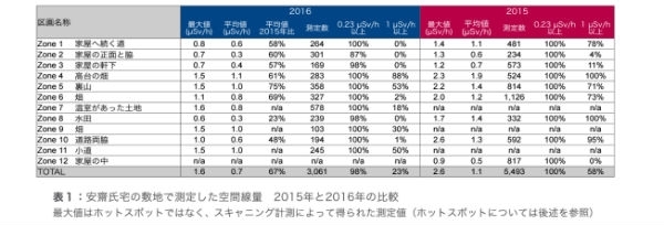 チェルノブイリ原発事故の被害を受けたウクライナでは、生涯に70ミリシーベルトを超える放射線を浴びてはいけないとしていますが、安齋さんのお宅では、これをはるかに超えて被ばくしてしまうことになります。 また、毎時0.7マイクロシーベルトというのは、本来、「放射線管理区域*」にすべき線量です。 なお、毎時0.7マイクロシーベルトという数値は、安齋さんのお宅の様々な地点で測った数値の平均です。実際には、安齋さんにお話を伺いながら、事故前の普段の生活で使っていた場所を、この表のようにゾーンごとに測定しています。ゾーンごとに平均を出し、さらにその加重平均の数値が毎時0.7マイクロシーベルトです。 ![]()