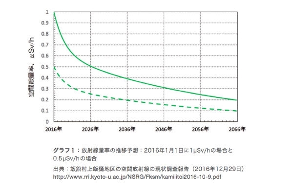 調査結果の発表に先立って、安齋さんをはじめ、調査に協力してくださった住民のみなさんにご報告にうかがうと、安齋さんはそうおっしゃり、報告内容を聞いてくださいました。 私は、「帰る、帰らないを決めるのは、住民のみなさん自身です。どちらを決めても、その意思を尊重します」とお伝えした上で、ご報告しました。 「放射線管理区域」で暮らせますか?安齋さんのお宅周辺では、平均毎時0.7マイクロシーベルトが計測されました。 これをもとにすると、2017年から70年間の生涯被ばく線量は約90ミリシーベルトになると推定されます。* *下表より、屋外で8時間過ごす場合。レポート「遠い日常」より。空間線量の推移を、放射線崩壊を考慮に入れて予測し、累積線量を見積もった。