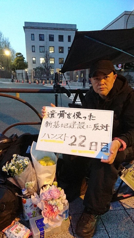3月8日、「遺骨を使った新基地建設に反対」と書いたホワイトボードを掲げ、泊まり込みで官邸前でのハンストを始めた。口にするのは水や塩、支援者から差し入れられた具なしのスープぐらい。同30日まで、その場に敷いたビニールシートで休みながらハンストを続けた。 存在を知り、励ましに駆けつけた人たちの中には、日本兵だった祖父を本島南部で亡くした女性もいた。祖父の遺骨は家族の元に戻っておらず、女性は祖父の所属部隊がいた本島南部も訪れたといい「遺骨の代わりにそこで石を拾い、墓に入れた」と話したという。