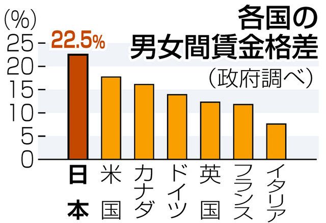 日本で非正規を含む女性のフルタイム労働者の賃金は男性より22.5%低く、主要七カ国では最も格差が大きい=グラフ。