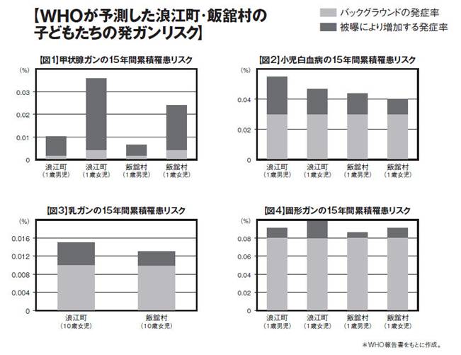 10月20日、環境省が所管する「東京電力福島第一原子力発電所事故に伴う住民の健康管理のあり方に関する専門家会議」(以下、専門家会議)の第12回会議が東京・港区で開かれた。 「がん疾患の発症増加が確認される可能性は小さい」(『毎日新聞』2013年2月28日) 「大半の福島県民では、がんが明らかに増える可能性は低いと結論付けた」(『朝日新聞』同年3月1日) などと報じられてきた。報道を見る限り、UNSCEAR報告書の内容と大差はなく、専門家会議がそこまで嫌う理由が全くわからない。 そこで、WHO報告書の原文を取り寄せ、精読してみたところ、驚くべき「評価内容」が浮かび上がってきた。 ■WHOは若年層での「ガン多発」を明言していた 英文で160ページ以上にも及ぶ同報告書では、ガンと白血病の発症リスクを詳細に評価。その結果、深刻な放射 この報告書をまとめるにあたり、主な「評価対象」とされたのは、避難が遅れた浪江町と飯舘村の「計画的避難区域」に暮らしていた住民たちだ。 評価では、汚染地帯から避難するまでに4カ月かかったと仮定。他にも、汚染された福島県産の食材を食べ続けたと仮定するなど、過小評価を避けるための仮定を積み重ねたうえで、住民の推定被曝線量を弾き出している。 WHO報告書によると、多発が極めて顕著なのは小児(注2)甲状腺ガン。被災時に1歳だった女児の場合、浪江町では事故発生からの15年間で発症率は9倍(被曝前の発症率0.004%→影響を考慮した発症率0.036%)に増え、飯舘村でも15年間で6倍(同0.004%→同0.024%)に増えると予測した(同報告書64ページ。【図1】)。 もともと幼少期の甲状腺ガン発症率は非常に低い。従って、幼少期に被曝した場合のリスクを、原発事故発生からの15年間に絞って計算すると「小児甲状腺ガンと被曝との関係性がより明白になる」と、WHO報告書は言う。 ひょっとするとこの部分が、原発事故による健康被害は「ない」とする評価を続ける環境省や専門家会議の癇に障ったのかもしれない。 多発が予測されたのはそれだけではない。 小児甲状腺ガンほどではないにせよ、小児白血病も多発するという。被災時に1歳だった男児の場合、浪江町では事故発生からの15年間で発症率は1.8倍(同0.03%→同0.055%)に増え、飯舘村では15年間で1.5倍(同0.03%→同0.044%)に増える。1歳女児の場合、浪江町では事故発生からの15年間で発症率は1.6倍(同0.03%→同0.047%)に増え、飯舘村では15年間で1.3倍(同0.03%→同0.04%)に増える(同報告書62ページ。【図2】)。 そして、乳ガンも増える。被災時に10歳だった女児の場合、浪江町では事故発生からの15年間で発症率は1.5倍(同0.01%→同0.015%)に増え、飯舘村では15年間で1.3倍(同0.01%→同0.013%)に増える(同報告書63ページ。【図3】)。 さらには、固形ガンも増える。被災時に1歳だった男児の場合、浪江町では事故発生からの15年間で発症率は1.14倍(同0.08%→同0.091%)に増え、飯舘村では15年間で1.08倍(同0.08%→同0.086%)に増える。1歳女児の場合、浪江町では事故発生からの15年間で発症率は1.24倍(同0.08%→同0.099%)に増え、飯舘村では15年間で1.14倍(同0.08%→同0.091%)に増える(同報告書62〜63ページ。次ページ【図4】)。つまり、福島県の若年層におけるガンは、甲状腺ガン、白血病、乳ガン、固形ガンの順に増加すると、WHO報告書では予測している。 (注1)同報告書の英語名は『Health risk assessment from the nuclear accident