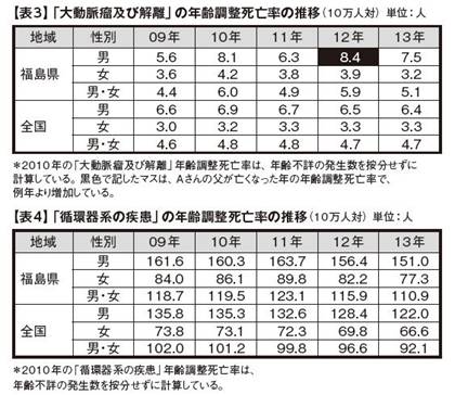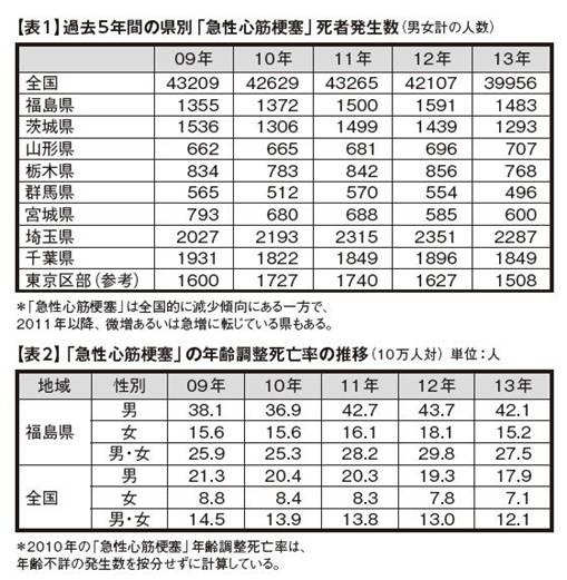 手紙の趣旨は、急性心筋梗塞以外の循環器系疾患にも目を向けてほしい──というものだった。指摘を受けて本誌取材班は、最新の「2013年人口動態統計」データを入手し、福島県における「循環器系の疾患」による死者数の推移を検証することにした。 【表2】を見てほしい。全国の値が右肩下がりで減少し続ける中、福島県は原発事故発生翌年の12年に「人口10万人当たり29.8人」(男性は同43.7人)という全国ワーストの値を記録。翌13年は同27.5人(男性は同42.1人)と、少々下がったものの、いまだに原発事故前の値(10年は同25.3人。男性は同36.9人)を上回り続け、高い死亡率のまま推移している。 急性心筋梗塞で亡くなる方の13年全国平均は同12.1人(男性は同17.9人)。 福島県の同死亡率はその2倍以上ということになる。原発事故以降の福島県での急性心筋梗塞多発という“異常さ”が、3年連続で際立つ結果となった。