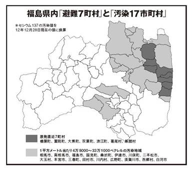 (注2)楢葉町、富岡町、大熊町、双葉町、浪江町、葛尾村、飯舘村の7町村。 (注3)セシウム137の汚染値を、12年12月28日現在の値に換算したもの。 (注4)相馬市、南相馬市、福島市、国見町、桑折町、伊達市、川俣町、二本松市、大玉村、本宮市、三春町、田村市、川内村、広野町、須賀川市、西郷村、白河市の17市町村。